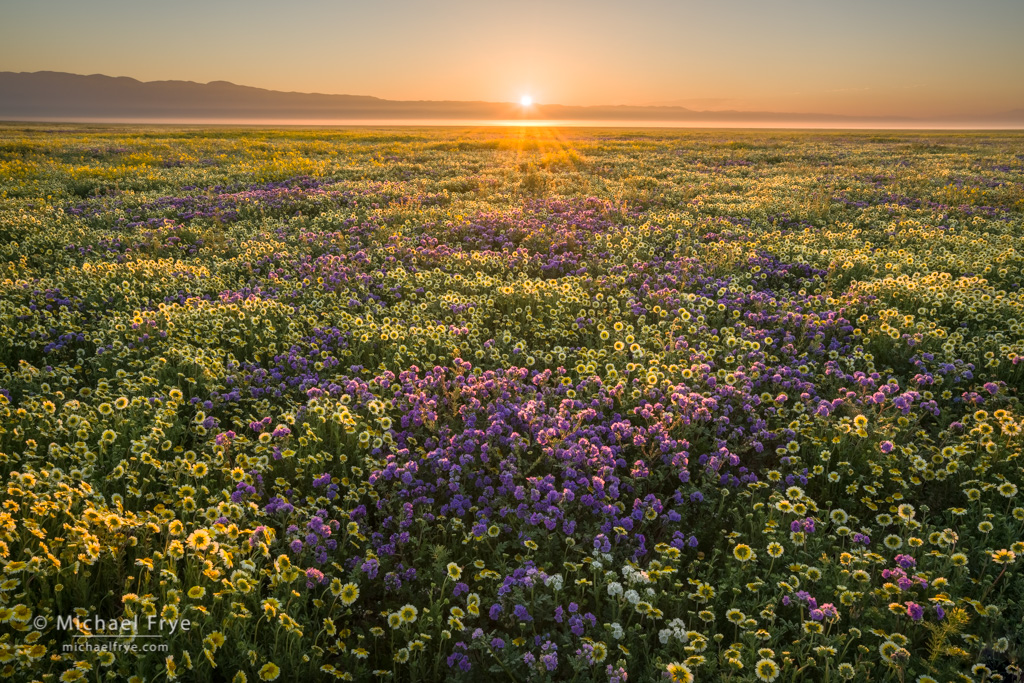 Endless flowers, Carrizo Plain National Monument. This was a very contrasty scene, so I bracketed five frames, each two stops apart, and blended them with Lightroom’s HDR Merge. Normally I would try to capture a photograph like this when just the edge of the sun first peeked over the horizon, in order to avoid lens flare. I did that here, but then kept shooting, knowing that the sun needed to get above the horizon to light the foreground flowers. In this image, made about two minutes after the sun first appeared, the sun was high enough to create some beautiful backlight on the flowers, but luckily there was still no flare. 22mm, f/16, 100 ISO