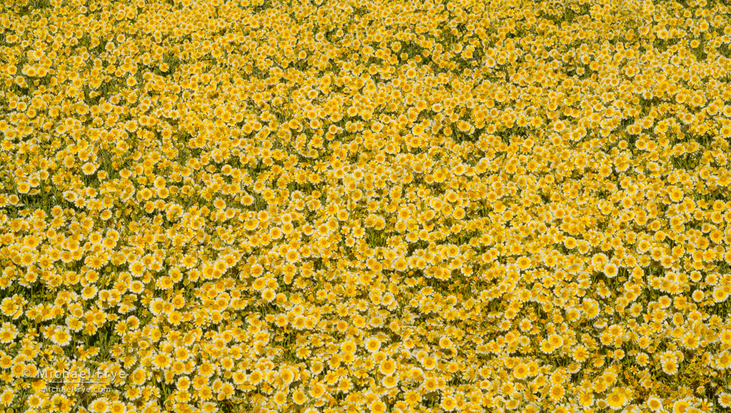 Wall of tidytips, Carrizo Plain National Monument. I had been concentrating on photographing tidytips with backlight, but then decided to turn around and see what they looked like with frontlight. They looked great, forming wonderful patterns. I picked out a particularly dense patch and zoomed in to fill the frame. 135mm, 1/45 second at f/16, 100 ISO, focus-stacked.