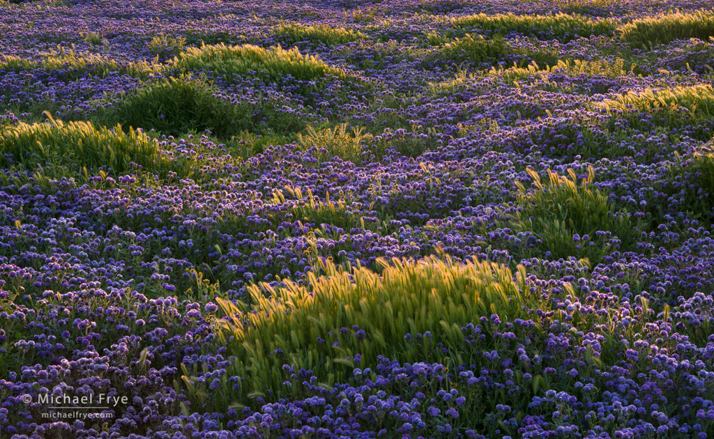 Waves of foxtail grass amid a sea of valley phacelia, Carrizo Plain National Monument. One afternoon we walked out toward the purple lake in the middle of the monument. Near the edge of this lake we found the phacelia mixed with some beautiful foxtail grasses, backlit in the warm, late-day light. 127mm, 1/6 second at f/16, 100 ISO, focus-stacked.