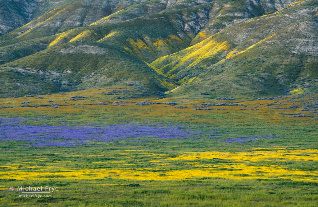 Thanks so much Brenda! I’m a little puzzled though by your comment about fences, as I don’t remember finding many fences in the way. There are fences, to be sure, but in the middle of the monument there are huge flower-filled tracts (or there were this year) without any fences. There are some fences along the eastern side of Elkhorn Road in places, and some of that is apparently private land, but there are few signs, and it’s hard to tell what’s public and what’s private over there. So many of the best flower spots in California are on private land, and I’ve taken a lot of photos from roadways looking over fences, so I actually found it refreshing that I could roam around freely in many places in the Carrizo Plain.