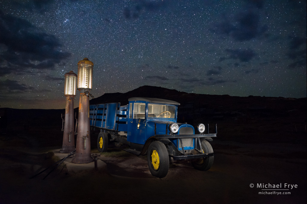 Below you’ll find a few more images I made at night in Death Valley this past spring, with extended captions to explain how they were made. In one I used a hand-held flashlight; in two others I set up continuous lights on stands. The rest were made with natural moonlight.