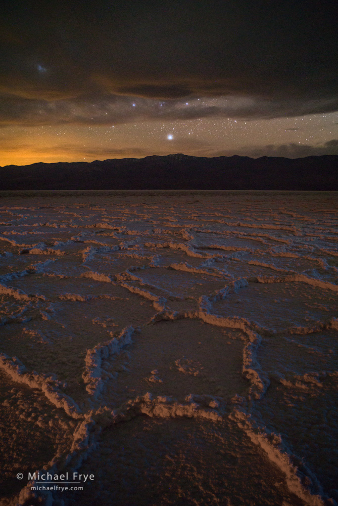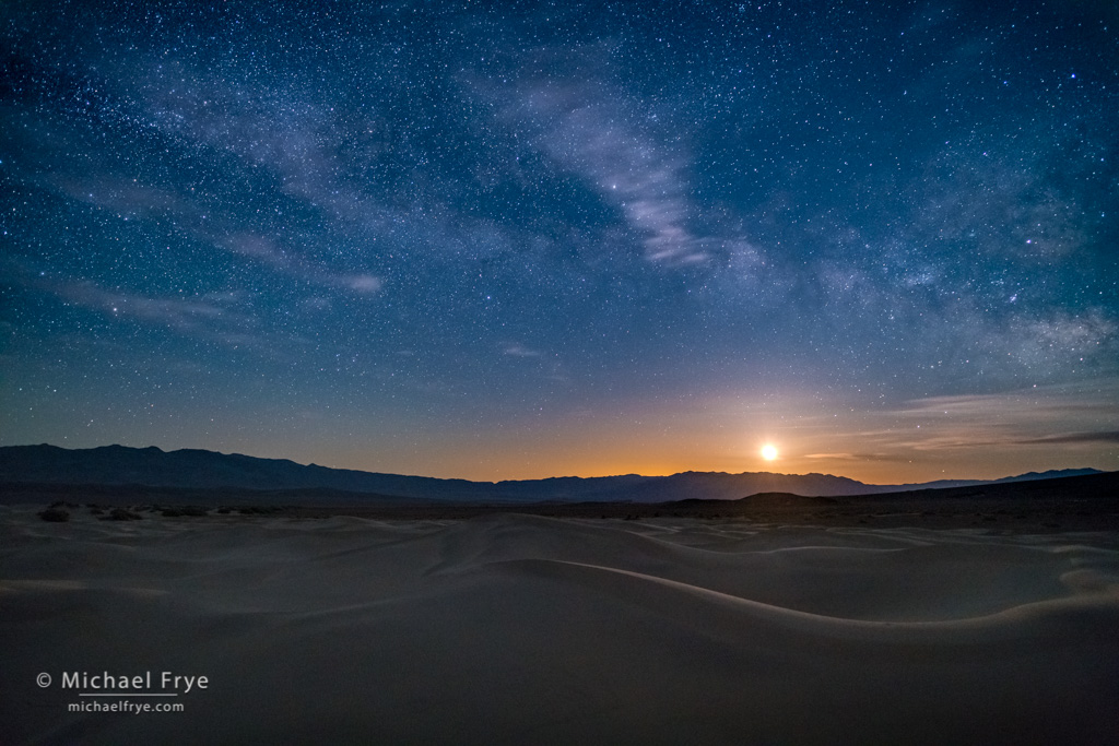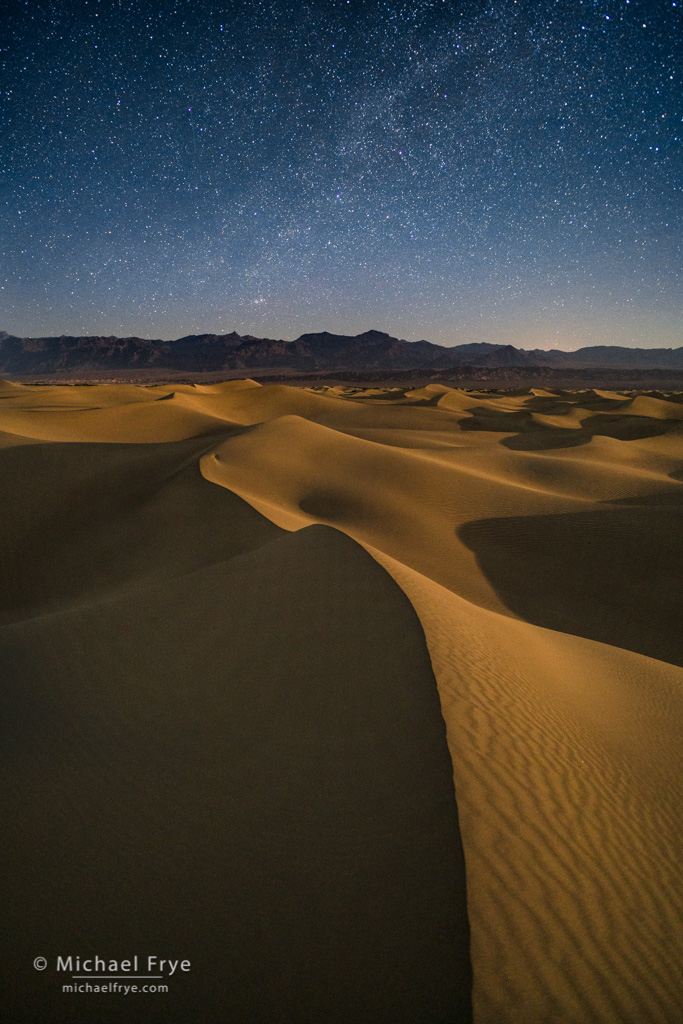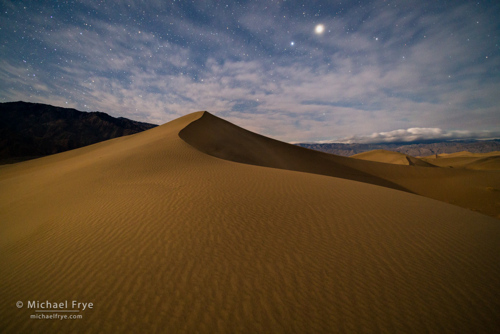 It’s been a busy spring, so I have a backlog of images that I haven’t been able to post yet. Among those images are most of the nighttime photos I made during our two Death Valley workshops (as well as beforehand, while scouting). We encountered a lot of wind, which made things challenging. You just don’t want to be out in the dunes when it’s windy, because you and your gear will get sand-blasted. But the wind helped wipe footprints off the sand, and somehow, during both workshops, we managed to get out into the footprint-free dunes on calm, clear, beautiful nights.