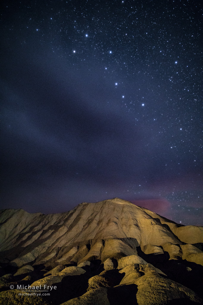Twenty Mule Team Canyon with the Big Dipper, Death Valley. We set up continuous, low-level lighting for this scene too, so that our workshop group could photograph this view without coordinating exposures for light-painting. (Rokinon 20mms lens, 20 seconds at f/2.5, 5000 ISO.)