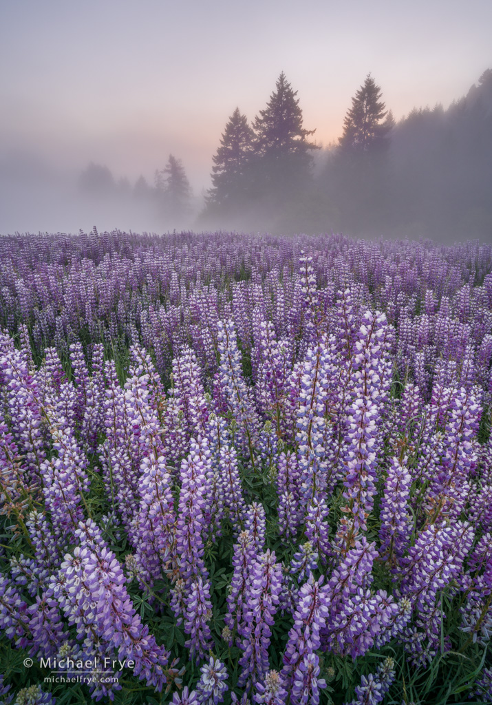 All my images shown here were made with a wide-angle lens (Sony 16-35 f/4), which is unusual for me. But the lupines weren’t mixed with other flowers, and therefore didn’t lend themselves readily to tight views focused on patterns of flowers. Also, the lupines were tall, so in most cases you had to get up close to see over the flowers to the trees (and sometimes fog) beyond. That required using a wide-angle lens and pointing the camera down to try to fill the foreground with flowers. Being so close to the lupines also meant that the exact camera position (including height) was important. In each of these compositions I tried to put the camera in front of a thick patch of flowers, and find an interesting pattern among the color.