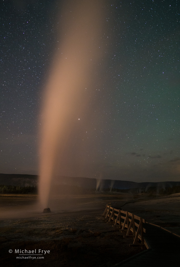 Claudia and I got a late start, arriving at Geyser Hill a little before 10:00 p.m. But it didn’t look like Beehive had erupted yet, as the boardwalk next to it was dry. It was difficult to find a composition that didn’t include the lights and buildings surrounding Old Faithful, but I finally found a view that worked, with the boardwalk as a leading line.