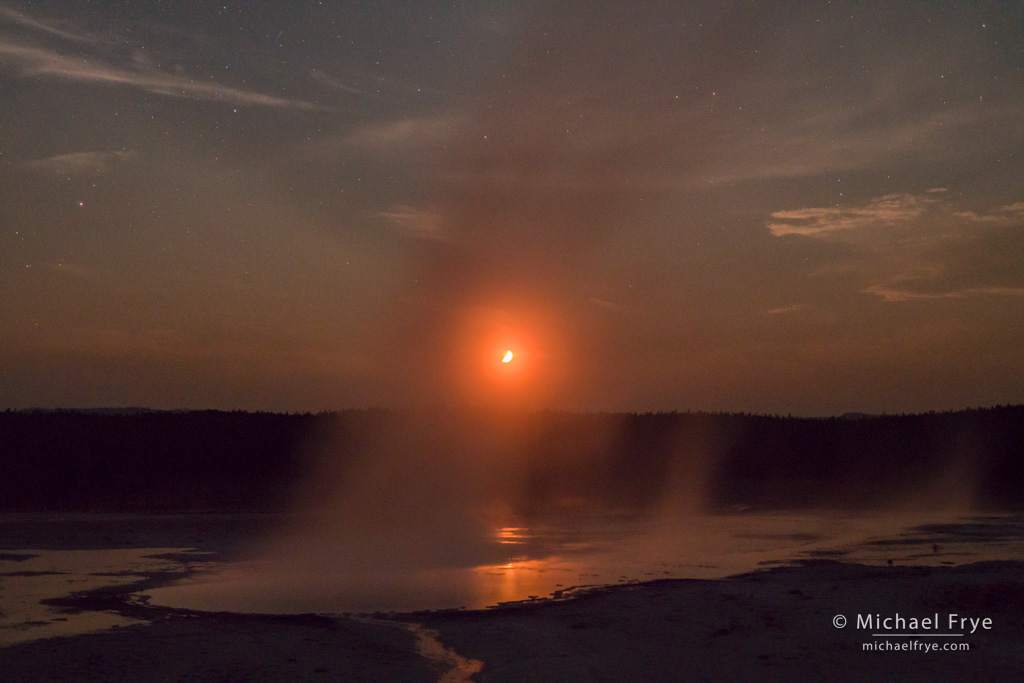 Celestine Pool and the setting moon, Yellowstone NP, WY, USA. On our last night in Yellowstone I photographed the half moon setting through the mist of this spring (and occasional geyser). 50mm, 8 seconds at f/5.6, ISO 6400.