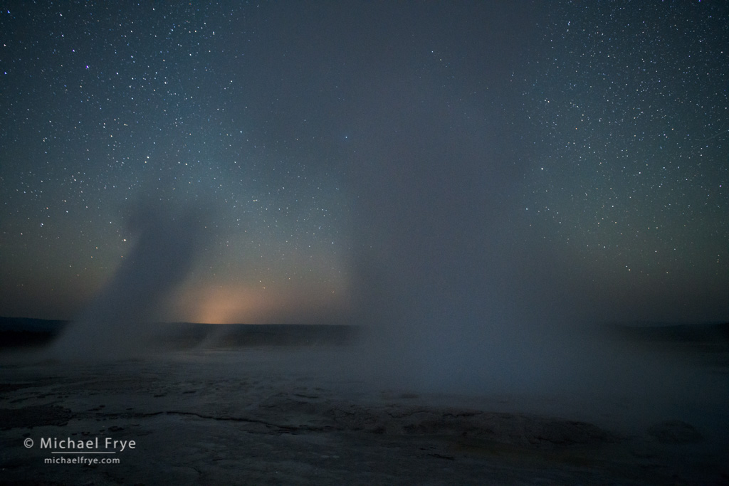 In all I spent four nights photographing the geysers and thermal areas in Yellowstone. Although I almost always add my own lighting to nighttime photographs, in Yellowstone I mostly just used starlight and moonlight, along with the lights from the buildings near Old Faithful, and an occasional car headlight. You’ll find extended captions with the images below to explain how they were made.