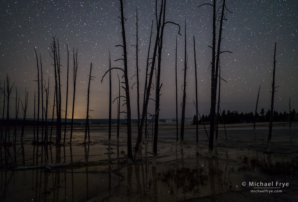 Trees and stars, Lower Geyser Basin, Yellowstone NP, WY, USA. I liked these trees silhouetted against the starry sky, with reflections of both in the water below. 20mm, 20 seconds at f/2.5, ISO 6400.