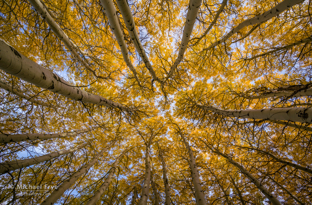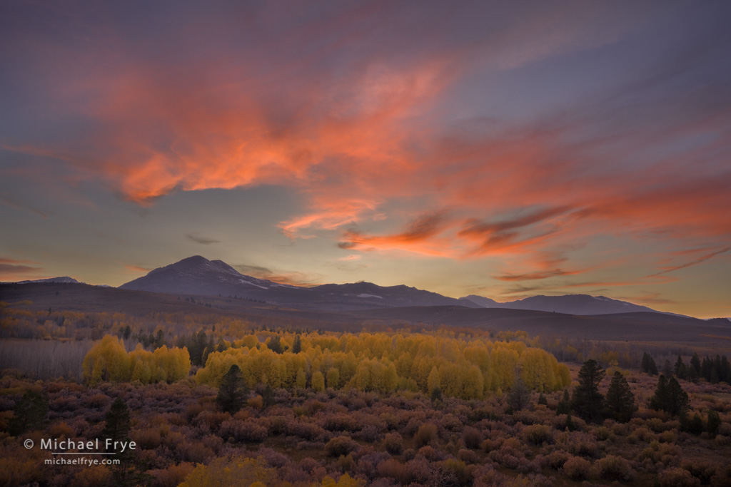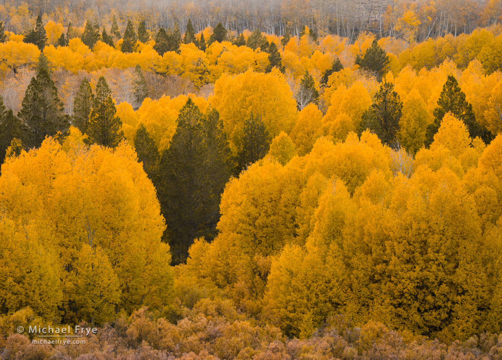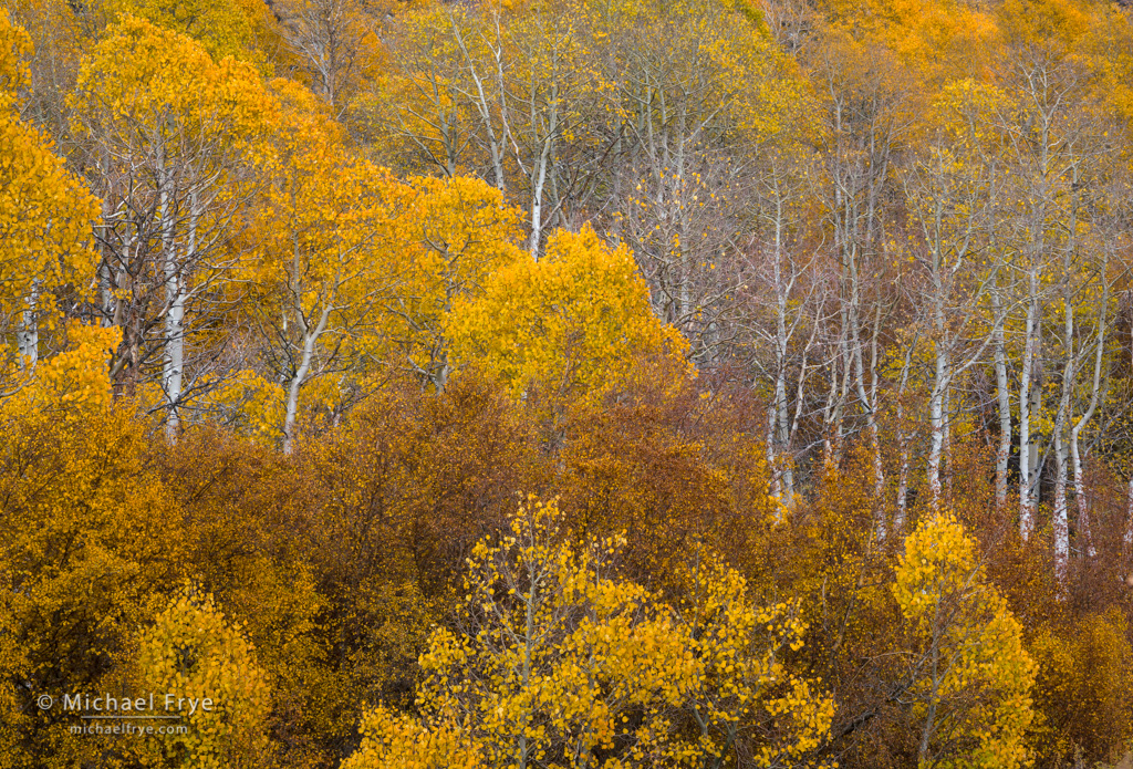 We just finished our workshop on the eastern side of the Sierra. When I arrived a few days before the workshop the aspen color was rather mixed, with bare trees, green trees, and every stage in between. But the weather was cold, and things turned quickly. By the time our workshop started most of the green leaves had turned yellow and orange, and we found lots of beautiful color – particularly along the June Lake Loop.