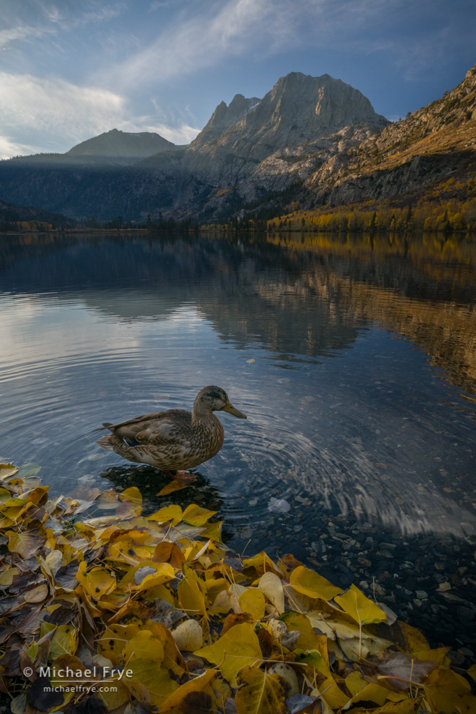 Mallard along the shore of Silver Lake, autumn, Inyo NF, CA, USA. This very tame mallard hen kept swimming in front of our group, hoping for handouts, then would stop and preen. At one point she started preening right in front of my camera, so I raised my ISO to 800 in order to get a fast enough shutter speed (1/60th sec.) to have some hope of freezing her motion, while keeping the aperture stopped down to f/16 to get everything in focus. She stopped preening and raised her head for a split second – just enough time to capture this image.