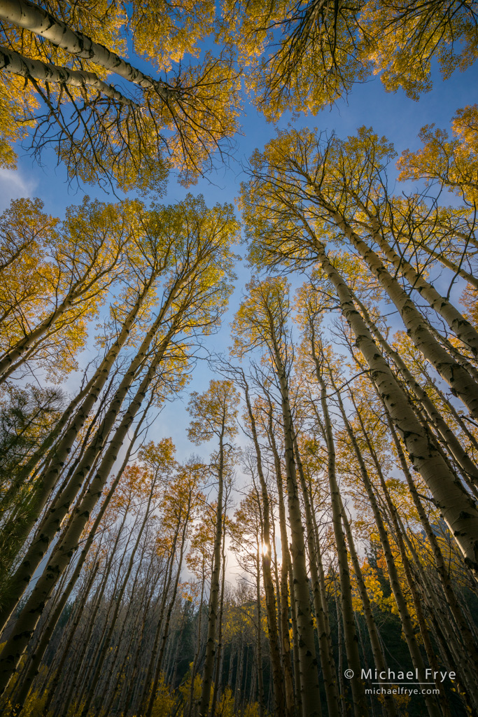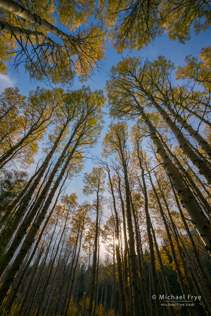 Here’s a before-and-after example of recent photograph from the eastern Sierra where I used the Color Range Mask to lighten and (slightly) change the hue of the green and gold leaves: