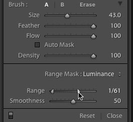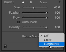 The Range Mask works in conjunction with the local adjustment tools (Adjustment Brush, Graduated Filter, and Radial Filter). It allows you to refine a selection based on luminosity or color, in order to adjust a precise range of tones or specific range of colors within part of the image.