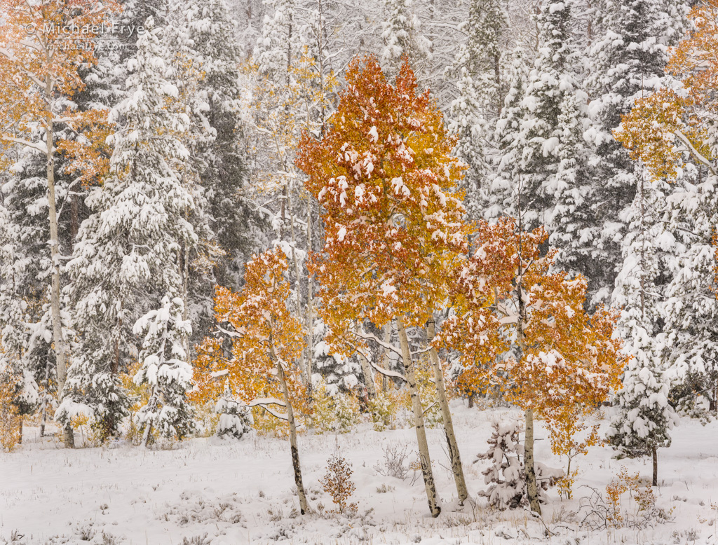 The forecasts then called for a big snowstorm in the mountains north of I-70, with up to 18 inches of snow at higher elevations. I love the combination of snow and autumn color, and it sounded like the major roads would be mostly below the snow line, so we decided to drive up to Steamboat Springs. It was snowing hard when we arrived at our hotel, with several inches of snow already on the ground, making us wonder if we might get stuck in Steamboat Springs for awhile. But the snow fell in squalls, and soon let up, allowing us to drive up Rabbit Ears Pass, where we found just what I was looking for – aspens covered in snow.