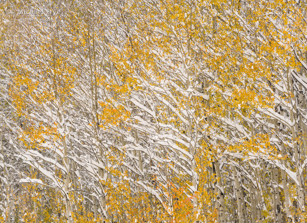 We chased the weather and color all over Colorado – or so it seemed. We reached the San Juan Mountains in the southwest corner of the state on September 27th, but found little color at that time. So we headed east and ended up near Twin Lakes, where I photographed aspens with snow and fog. Then we drove over Independence Pass and spent a couple of days around Aspen and Carbondale, braving the crowds to capture a misty view of the Maroon Bells.