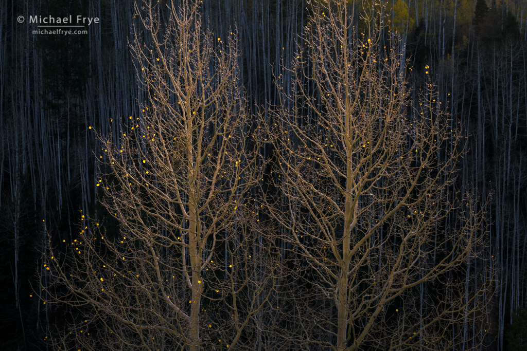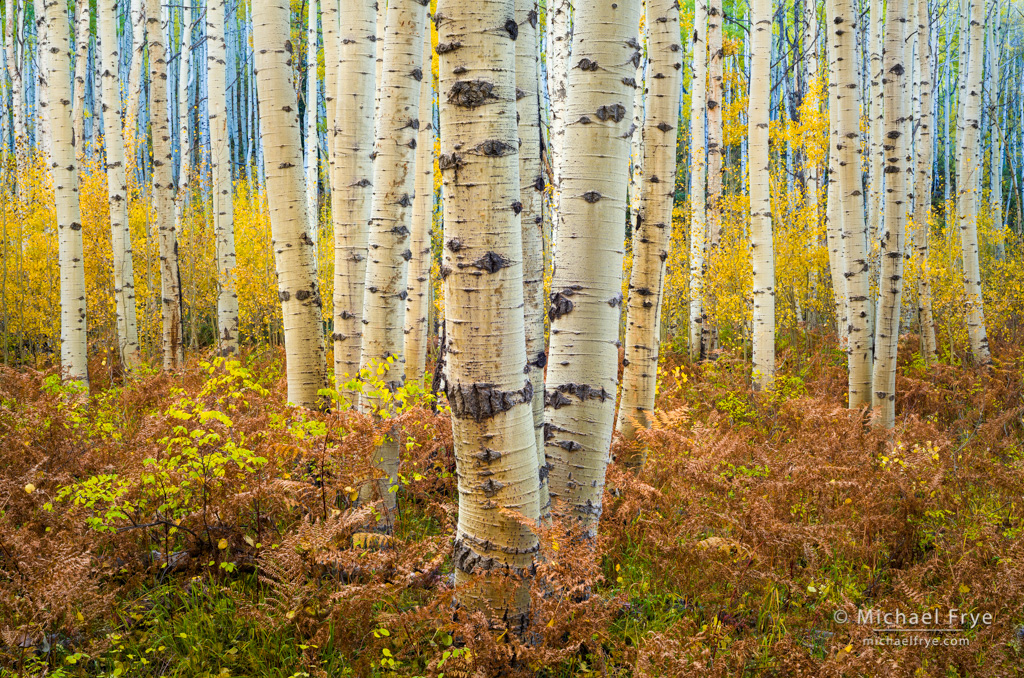 In fact one of my favorite images from the trip was made on a perfectly clear afternoon on the west side of Kebler Pass – the image at the top of this post. We found a beautiful grove of aspens underlain with ferns, and just as we arrived the sun dropped below the ridge to the west, plunging the scene into lovely, soft shade. The trunks in the distance turned blue, lit by the sky above. But the tops of the trees in the foreground were still lit by the sun, and those yellow, sunlit treetops cast a warm, amber glow onto the foreground trunks and ferns. The result was a beautiful, warm-cool color contrast created by soft light with differing color temperatures. I had seen this lighting effect before in an aspen grove in the eastern Sierra, and here it was again in this ferny, fairyland forest in Colorado.