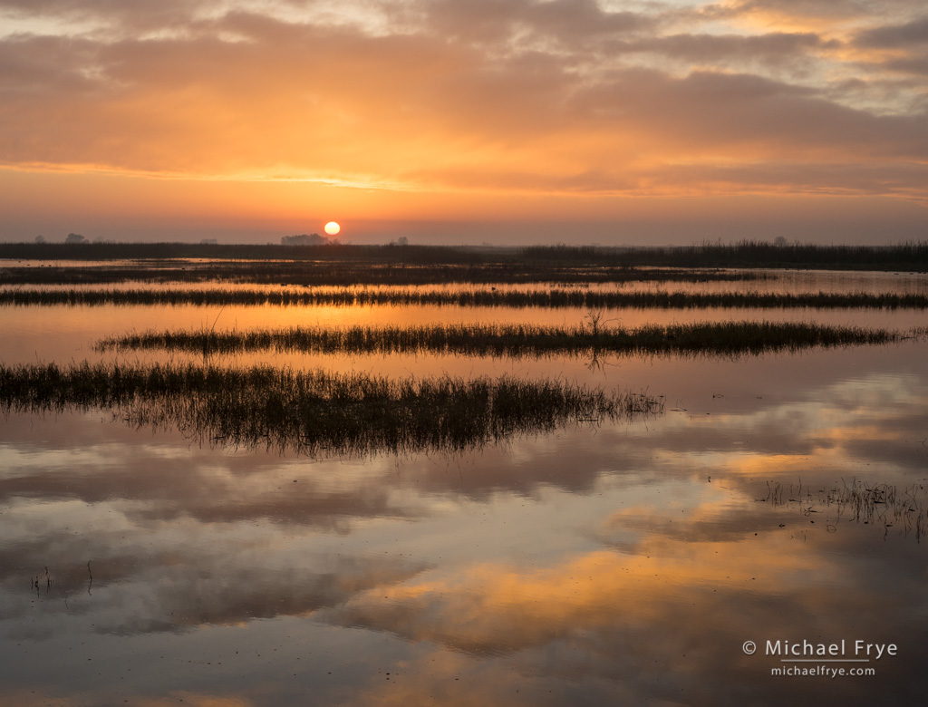 Sunrise in a San Joaquin Valley marsh, California. The sun provided a clear focal point here, but I needed something more, so I looked for some kind of pattern or design among the reeds. Eventually I found this spot, with the reeds creating layered bands across the frame, echoing the horizontal bands in the clouds.