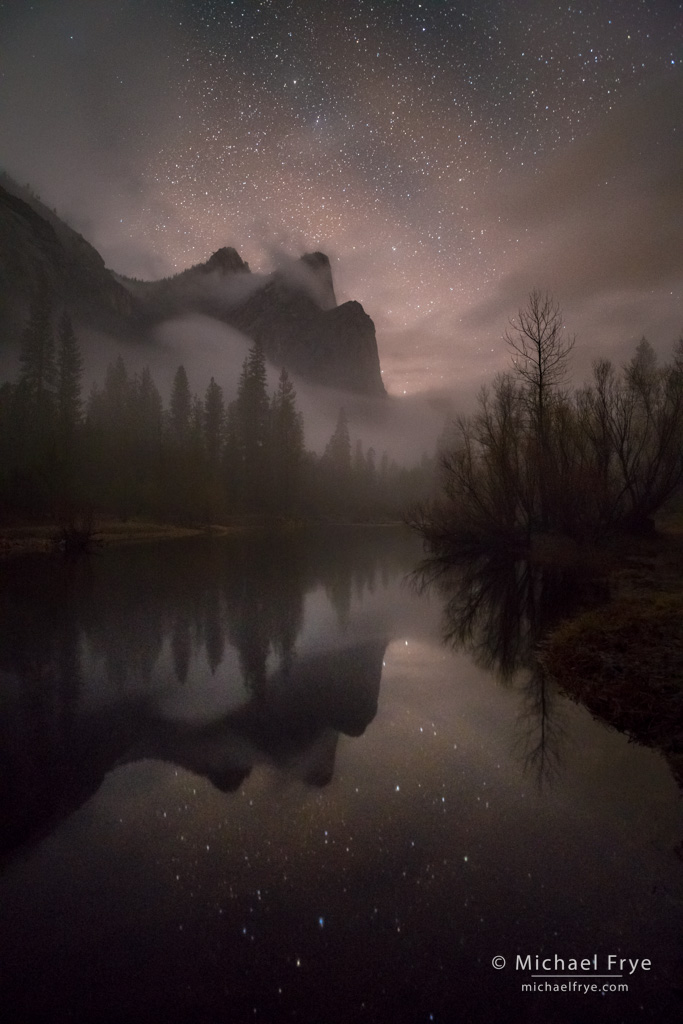 As the skies cleared, the mist increased, rising up to fill most of the valley, and obscuring the valley floor. I decided to drive down to a favorite location along the Merced River, where I caught the Three Brothers wrapped in mist, with stars above, before the fog closed in again: