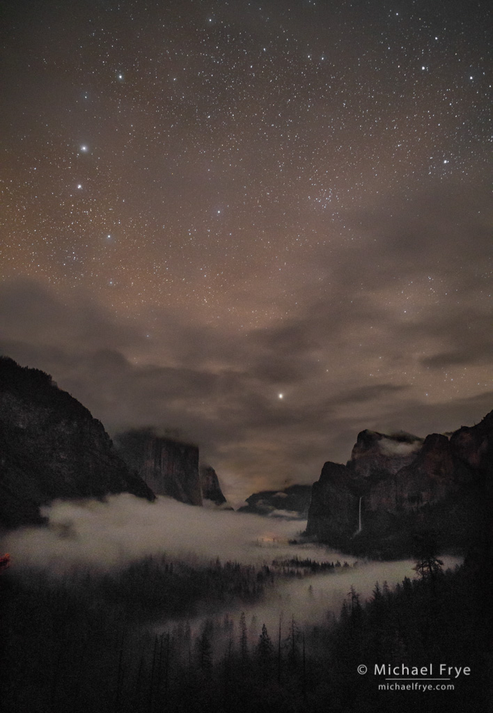 I woke about 1:00 a.m. It had stopped raining, and some stars were visible. I headed to Tunnel View, as I thought that might be a good to see the moonight starting to illuminate the clouds. The moonlight, however, seemed to be blocked by clouds further east. But the skies kept clearing, and I was able to photograph stars over the misty valley:
