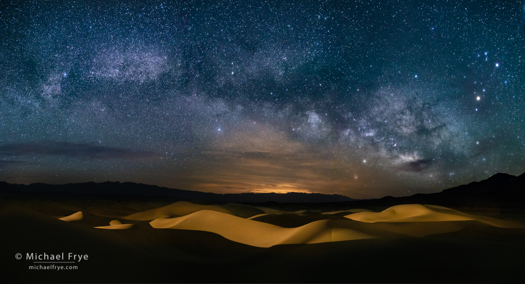 Milky Way over the Mesquite Flat Dunes, Death Valley. We set up continuous, low-level lighting on the dunes, using two LED light panels, so that we’d have consistent lighting for each frame while capturing multiple-image panoramas. I gave everyone a homework assignment before the workshop to practice capturing panoramas, as you don’t want to try that for the first time in the dark in the sand dunes! Everyone did really well and managed to capture a panorama that stitched together properly. I used Lightroom’s Panorama Merge to blend three images together for this final photograph. The exposures for each frame were 20 seconds at f/2.8, ISO 3200.