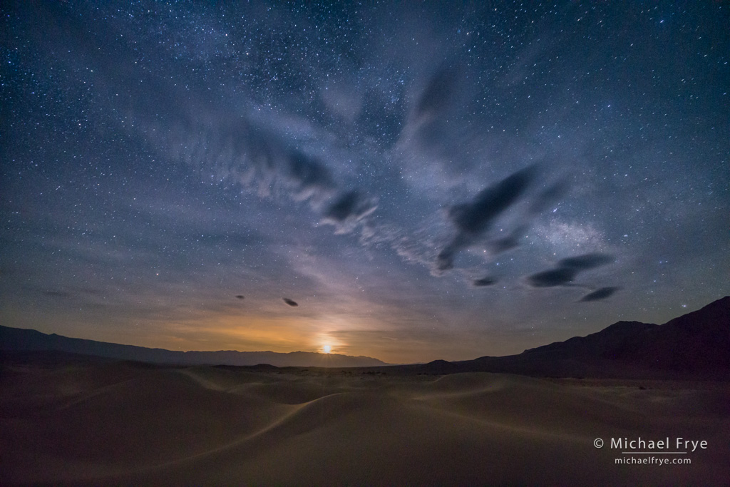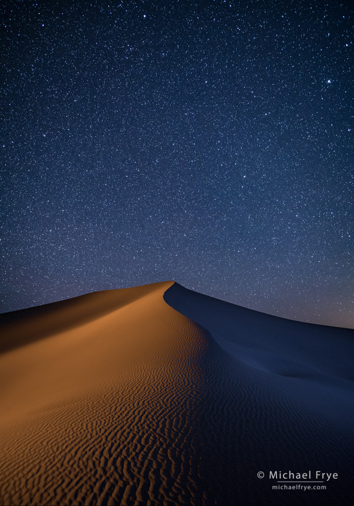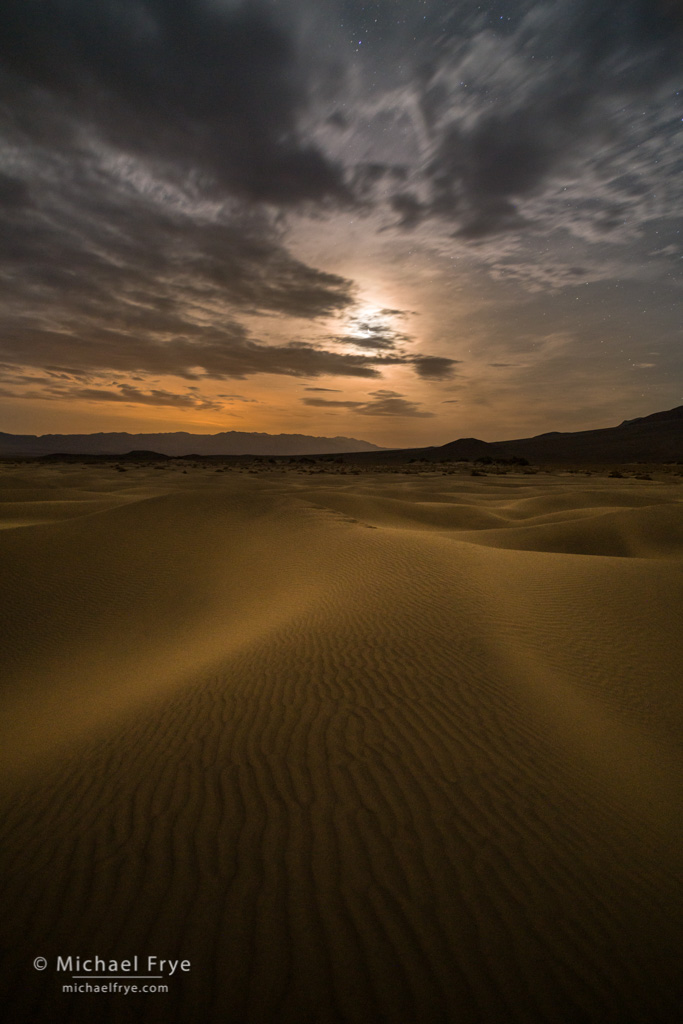 Moonlight on sand dunes, Death Valley. A blend of two exposures, one for the sky and one for the foreground. The sky was 20 seconds at f/4, ISO 2500, while the foreground was 20 seconds at f/2.8, ISO 5000.