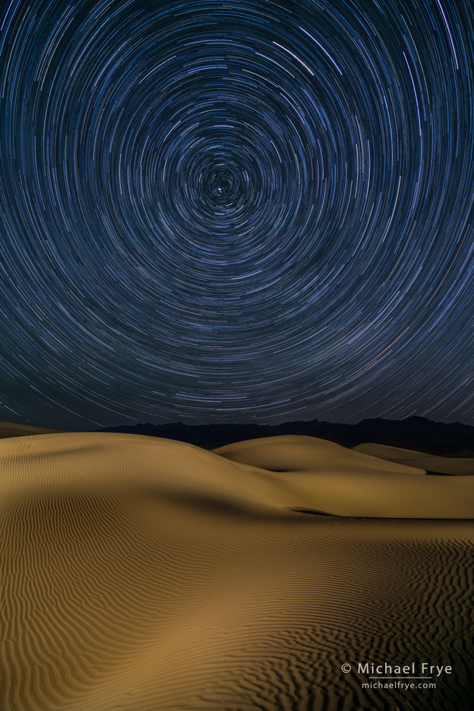 Star trails over the Mesquite Flat Dunes, Death Valley. We captured at least half a dozen light-painting frames for this star-trail photograph, but I used only three in the final image. Then there are 21 frames for the star trails, each four minutes at f/4, ISO 800. Again I used Photoshop to blend everything together.