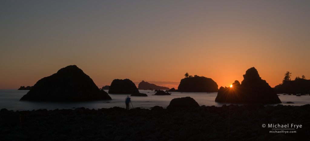 Photographer at sunset, Crescent City, CA. A 30-second exposure to smooth the water just as the sun met the rock.