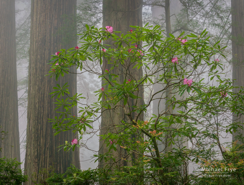 Redwoods and rhododendron in the fog, Del Norte Coast Redwoods SP, CA. The rhododendrons bloomed late this year, but we found a few, including this one, well-positioned against some redwood trunks in the fog.