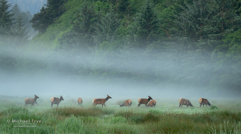 For example, there was no fog predicted for the first morning of our workshop. But we found fog in Del Norte State Park. In fact that was the only morning we found fog in that area. The forecast was a little more helpful on our third morning, when the National Weather Service predicted low clouds or high fog, and we got that – a cloud layer just low enough to engulf the Lady Bird Johnson Grove in fog. The coastal stratus then dissipated, but on our last morning we found some valley fog in the aptly-named Elk Meadow, complete with about 40 elk.