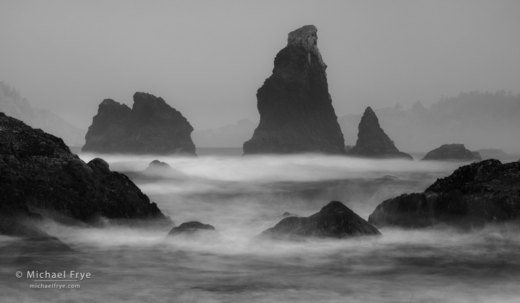 Sea stacks and surf near Trinidad, CA. There was a little fog here, just enough to lend some atmosphere to this scene. (The shutter speed was 4 seconds.)