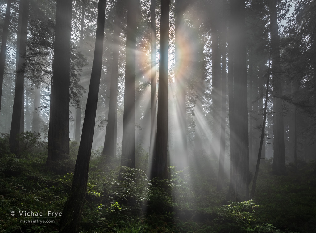Sunbeams and corona in a redwood forest, Del Norte Coast Redwoods SP, CA. I woke up early on this morning before the workshop, and didn’t see any fog, so I went back to bed. Later, about 8:00 a.m., I could see fog hugging a ridgetop in Del Norte State Park, where I knew there were redwoods. By the top I got there the fog was already dissipating, but it came and went for a little while, and for one fleeting moment I saw these beautiful sunbeams and corona.