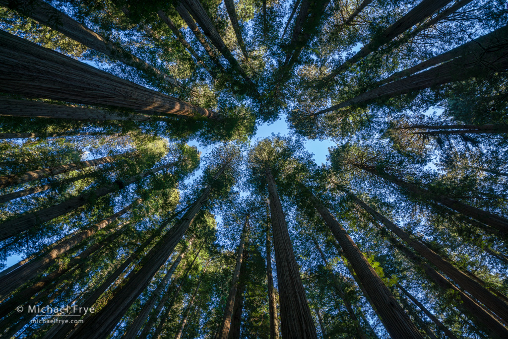 Towering redwoods, Jedediah Smith Redwoods SP, CA. This was a clear, sunny afternoon in the redwoods, and we found some great views looking up into the canopy.