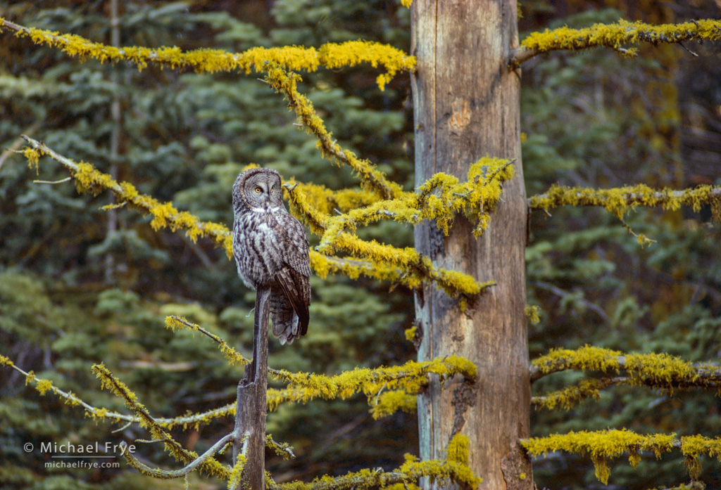 P.S. Here’s another great gray owl photo that I made in 1986 with a 300mm lens and 35mm film. I had seen my first ever great gray owl two days earlier in this same area. The night before I made this photograph I had a dream in which I was photographing a great gray owl surrounded by branches covered with staghorn lichen. The next morning I found this owl hunting along the edge of a meadow. It flew to another nearby small meadow, and I followed it. I slowly worked my way along the edge of this small meadow until I spotted the owl. I crept along, trying to get a better view, with my camera on my tripod, at the ready. Then I stopped in my tracks, as I realized that from where I was standing the owl was surrounded by branches covered in staghorn lichen – just like in my dream.