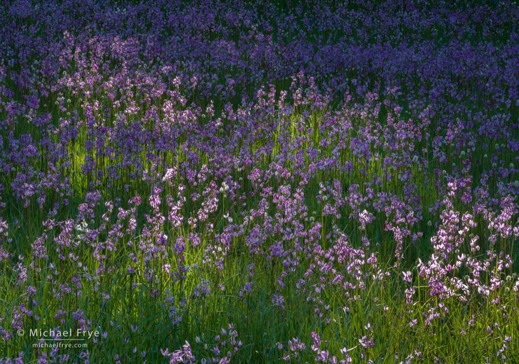 Shooting stars, summer wildflowers, Yosemite. Handheld (a rarity for me) at 1/200th sec., f/4, ISO 400. I’m almost always using medium to small apertures to get everything in focus, but once in awhile it’s fun to use a wide aperture to throw the foreground and background out of focus.