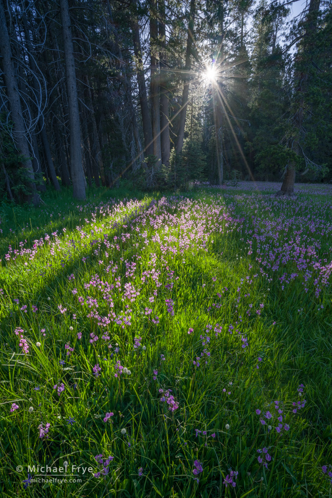 Shooting stars, sun, and lodgepole pines, Yosemite. I loved the stripes of light on the flowers, and decided to go wide to include the sun as well. I used Lightroom’s HDR Merge to blend three exposures, two stops apart.
