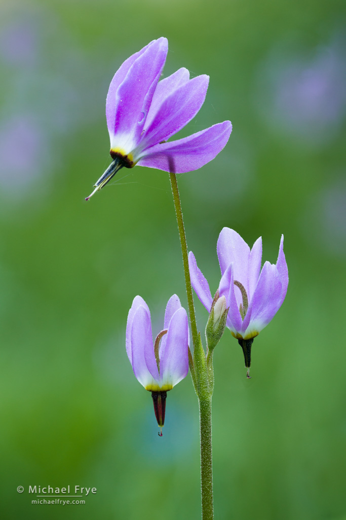 Three shooting stars, Yosemite. With closeup photographs like this it’s difficult to get all of the flower or flowers in focus, yet keep the background soft and out of focus. Here I set the aperture to f/5.6 to make sure the background was blurred, and focus-stacked 12 exposures to get the three flowers and their stems in focus.