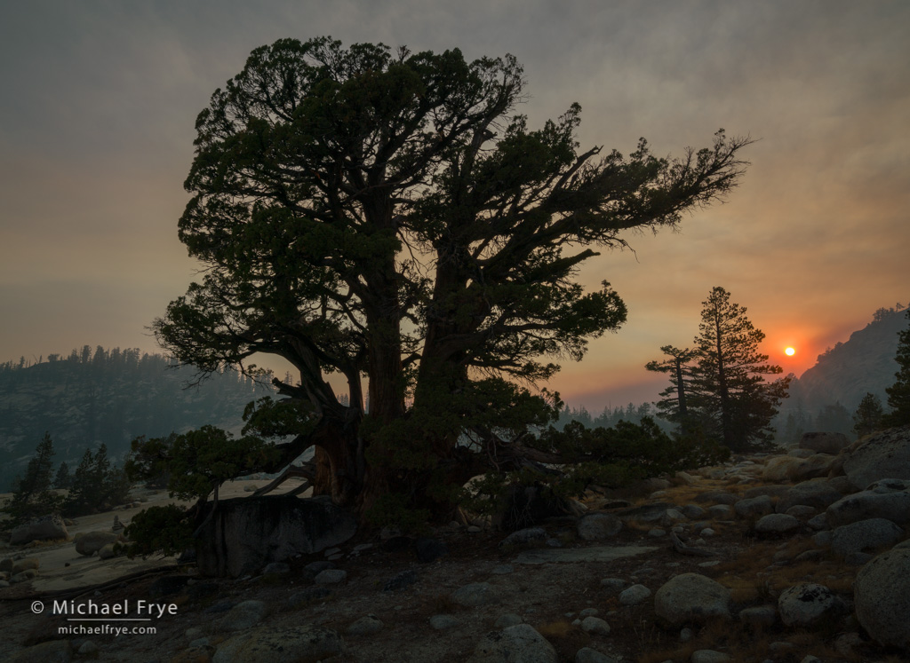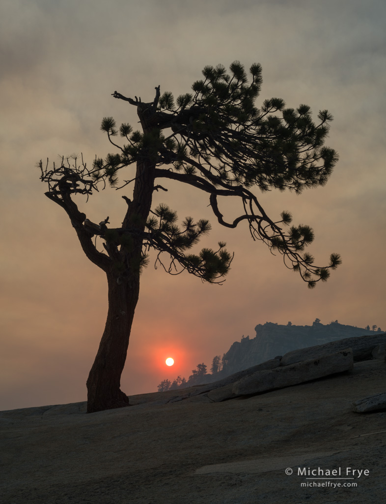 Smoky sunset at Olmsted Point with Jeffrey pine, Yosemite. Smoke often turns the sun into an orange ball when it’s high above the horizon, creating interesting juxtapositions that you wouldn’t normally see. I bracketed exposures here in case I needed to blend them together, but ended up using just the middle exposure of the bracketed set, balancing the contrast with Lightroom’s Highlights and Shadows sliders.