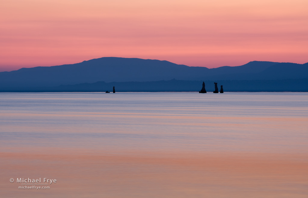 Hills and tufa formations at sunrise, Mono Lake. I made this on the same morning as the photo at the top of this post, as the smoke on the horizon turned red-orange in the predawn light. The shutter speed was 8 seconds to smooth out the water.