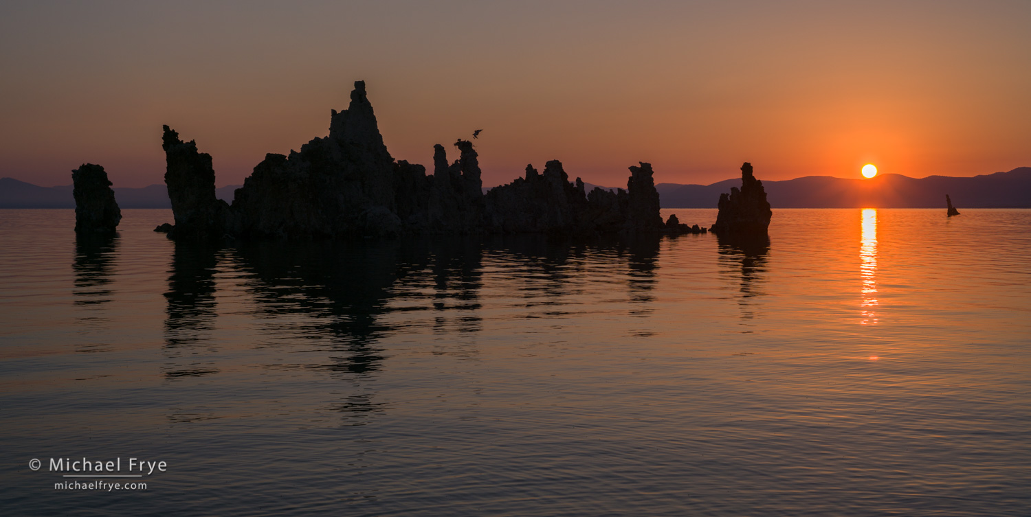 Osprey bringing a fish back to its nest at sunrise, Mono Lake. A thin band of smoke hung on the horizon to the east, turning the sun into a nice orange ball as it crested the horizon. We had watched an osprey bring a fish back to its nest on the tufa towers on a previous morning, so this time I was anticipating it. As the sun rose I heard the adult at the nest calling, so I got ready, setting my shutter speed to 1/350th of a second to freeze motion (at f/8 and ISO 100). The other adult flew in low and fast from the right, then rose up to the nest as I held down the shutter button. The bird is just a small accent at this size, but would be clearly visible in a big print.