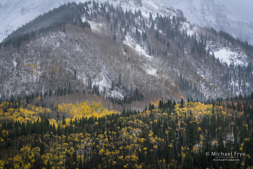 Sunbeams and aspens, Dallas Divide, Colorado. Claudia and I were headed to a more distant aspen grove, hoping to find snow on the trees, but saw some great sunbeams breaking through the clouds and decided to stop at Dallas Divide. We ended up staying for half an hour, with sunbeams moving across the landscape the whole time. For this image I bracketed five shots, two stops apart, and blended them with Lightroom’s HDR Merge.