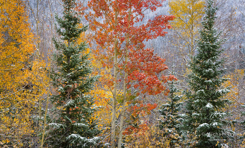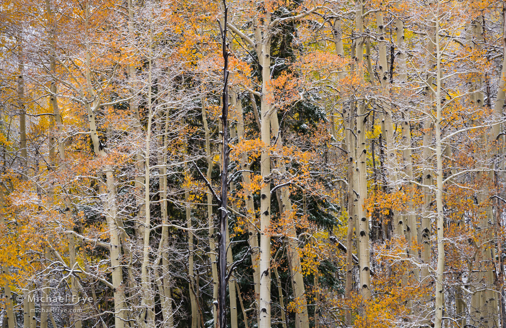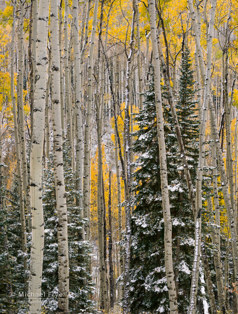 Oh what fun it is to play in snow showers with conifers and aspens in Colorado. Nice job.