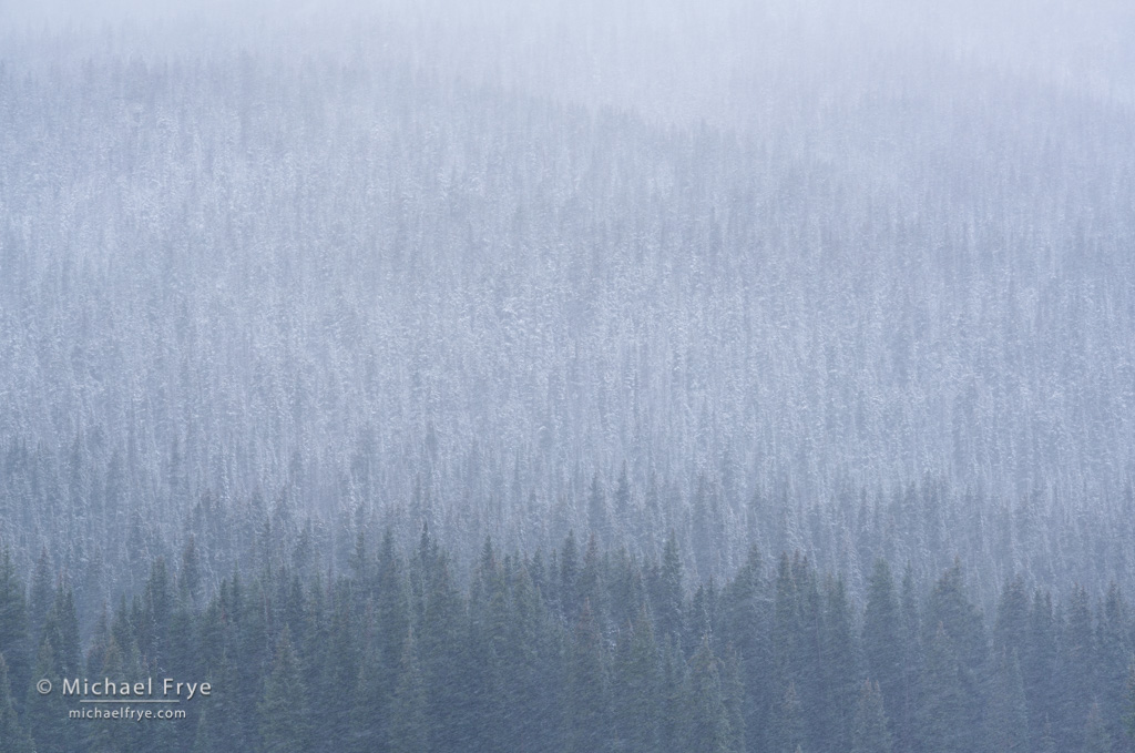 Snowstorm on Lizard Head Pass, Uncompahgre NF, Colorado. Claudia and I were driving around with our friend Charlotte Gibb and stopped near the top of Lizard Head Pass in a driving snowstorm, captivated by the patterns of snow-covered conifers.