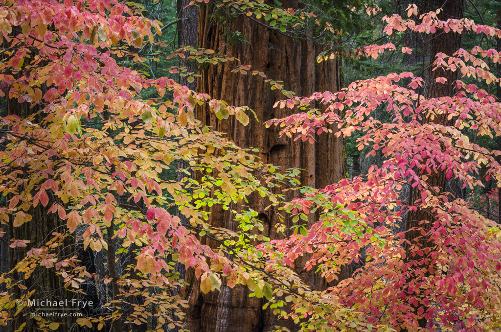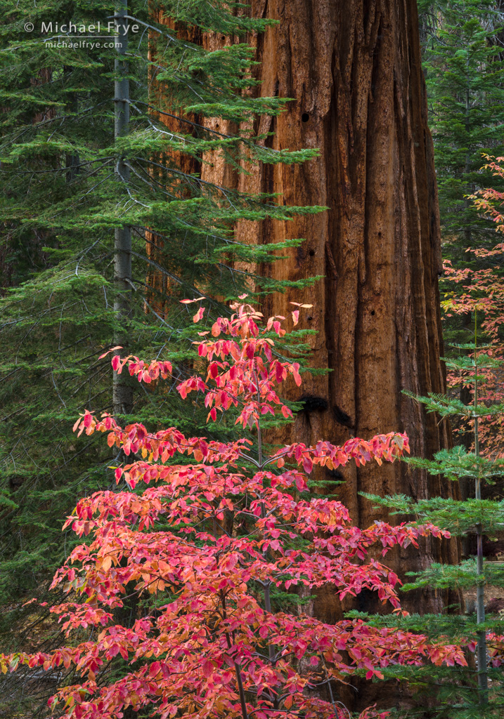 Dogwoods and giant sequoia, Yosemite. 81mm, 3 seconds at f/16, ISO 100, three images focus-stacked and blended with Helicon Focus.