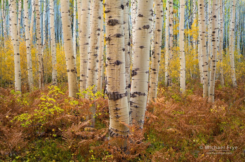 I made this photograph on a perfectly clear afternoon on the west side of Kebler Pass in Colorado. My wife Claudia and I found a beautiful grove of aspens underlain with ferns, and just as we arrived the sun dropped below the ridge to the west, plunging the scene into lovely, soft shade.