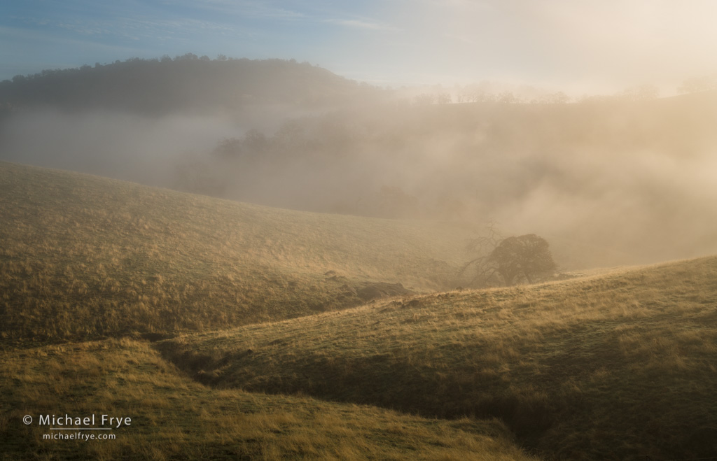 Grasslands, oaks, and fog, Sierra Nevada foothills, Mariposa County, California. 33mm, 1/60th of a second at f/11, ISO 100.