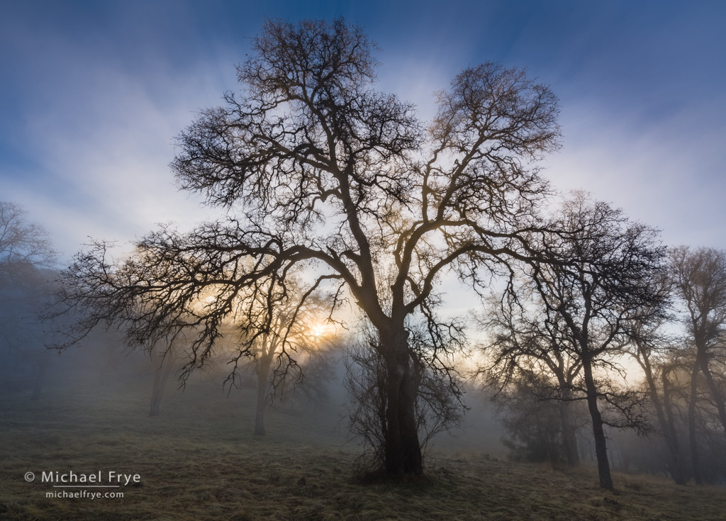 Sun breaking through the fog in a blue oak woodland, Mariposa County, California. 16mm, a blend of three exposures, two stops apart, at f/16, ISO 100, blended with Lightroom’s HDR Merge.