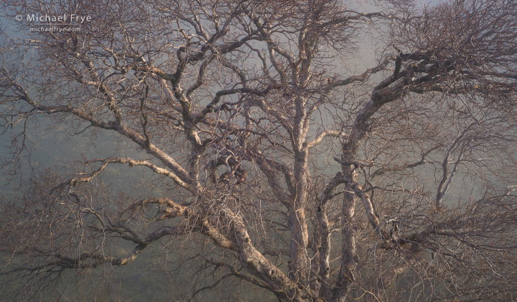Sycamore and fog, Sierra Nevada foothills, Mariposa County, California. 50mm, 1/8th of a second at f/16, ISO 100.