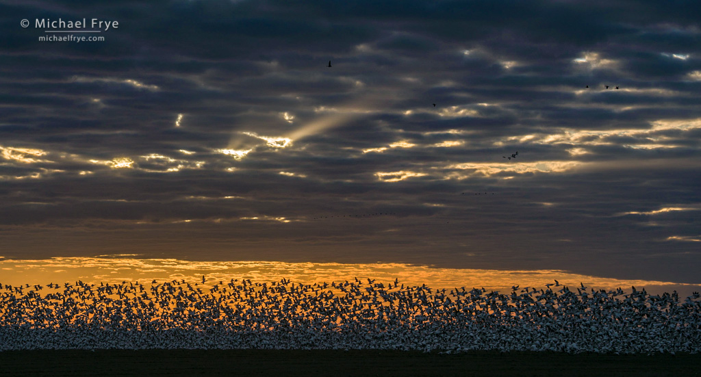 7. Sunbeams above a flock of Ross's geese, San Joaquin Valley, California