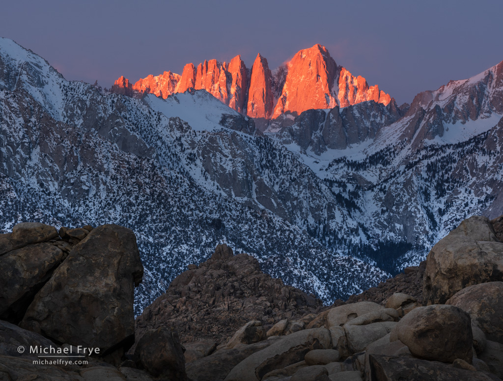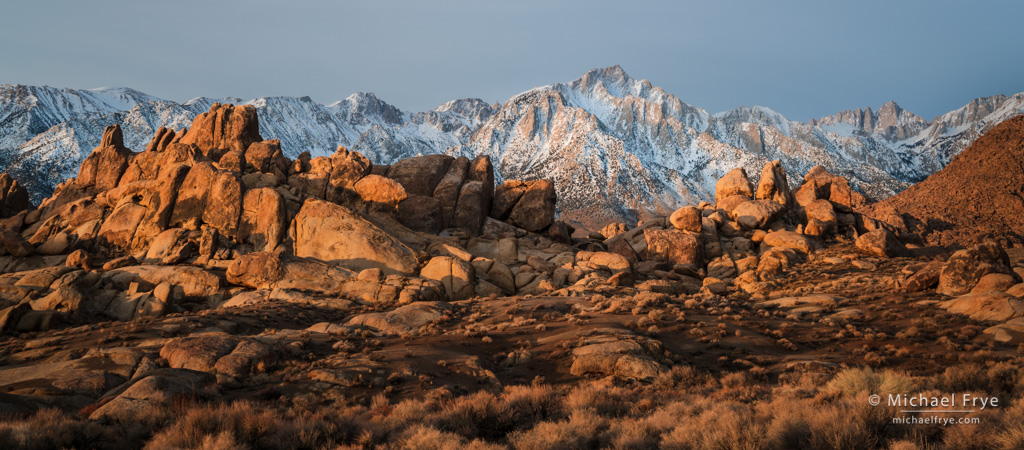 I was struck by the beautiful sunrise light in the Alabama Hills. In summer, and even early fall, the sun rises more-or-less behind you as the face the mountains. In winter the sun rises further south, raking across the ridges of the Sierra, and bringing out the textures of the foreground boulders.