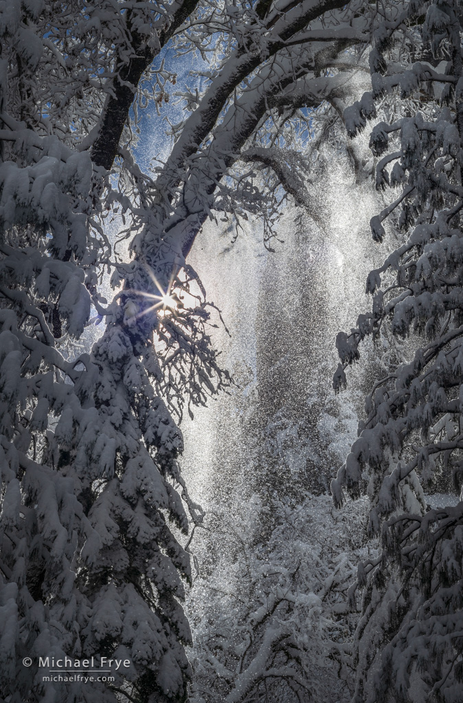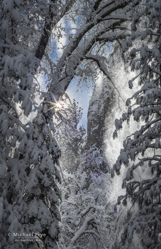 It was a very challenging situation to photograph. It was hard to even compose the picture since the scene was so contrasty, and I had to keep moving and re-composing to keep the sun partially hidden behind a tree trunk. I’d wait for some snow to fall, fire off a series of frames, and then move again, since the sun would be swinging out from behind the trunk and creating lens flare. So I’d step to the left, recompose, wait for more snow to fall, shoot a series of frames, step left again… and so on.