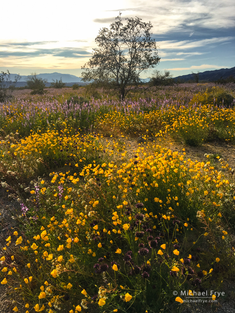 We found a beautiful spot with a mixture of poppies, lupines, brittlebush, and ocotillos, and photographed around this area as the sun dropped lower and the light got more interesting. But as pretty as this spot was, I couldn’t find a wide view to the west that I liked – a view that might work at sunset.